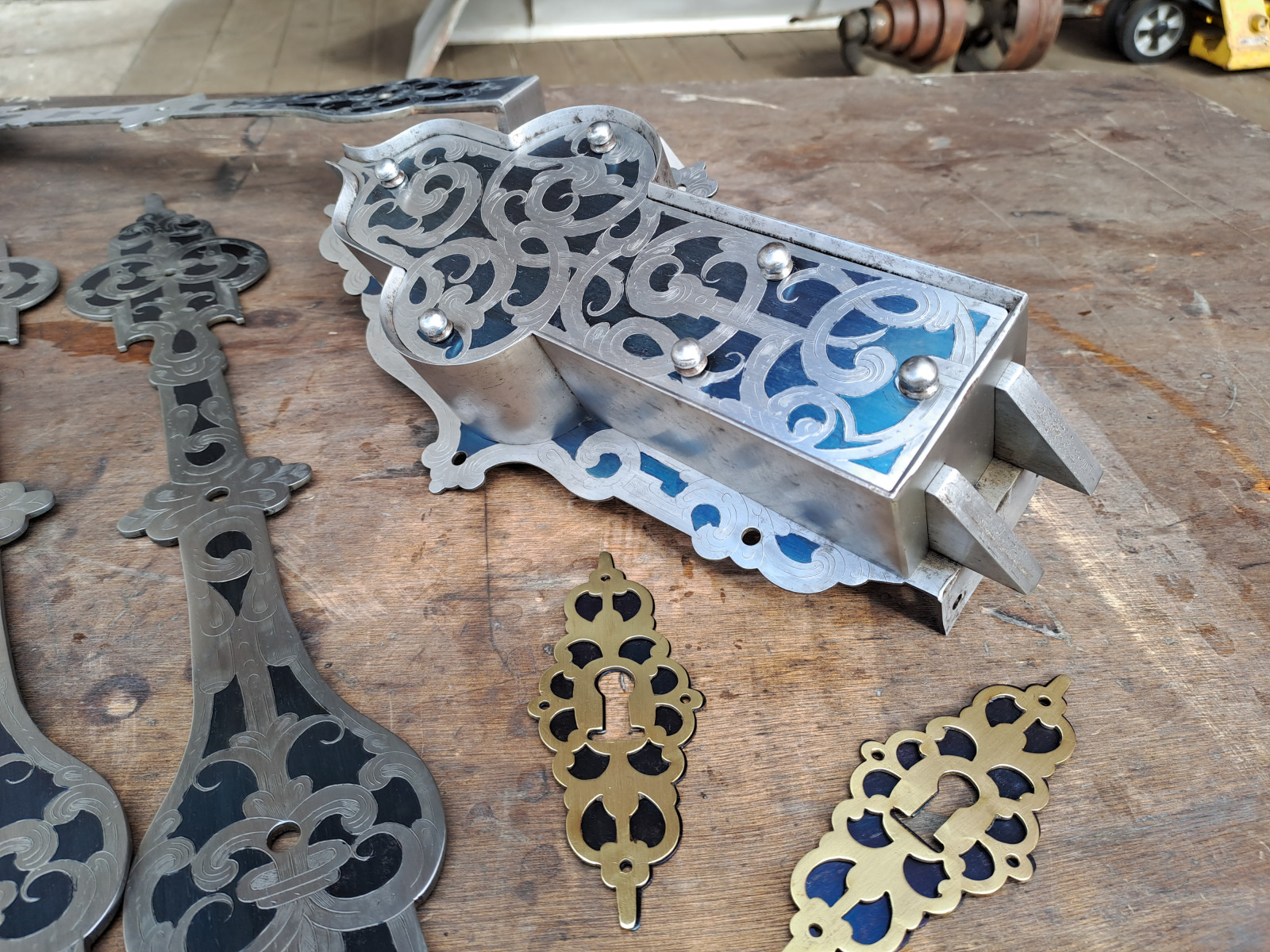 Bei der Sanierung alter Gebäude kommt der Einsatz moderner Beschläge oft nicht in Frage. Alte Türschlösser können meist mit wenig Aufwand wieder für viele Jahre funktionstüchtig gemacht werden. Wir fertigen auch komplett neue Beschläge in detaillierter Handarbeit und nach alten Vorlagen an. Unser stetig wachsender Lagerbestand an antiken Beschlägen und Schlössern bietet ausserdem die Möglichkeit, fehlende Stücke zu ersetzen.